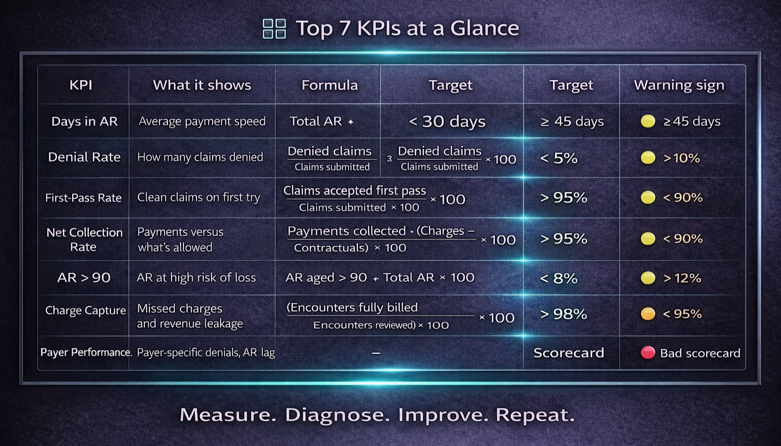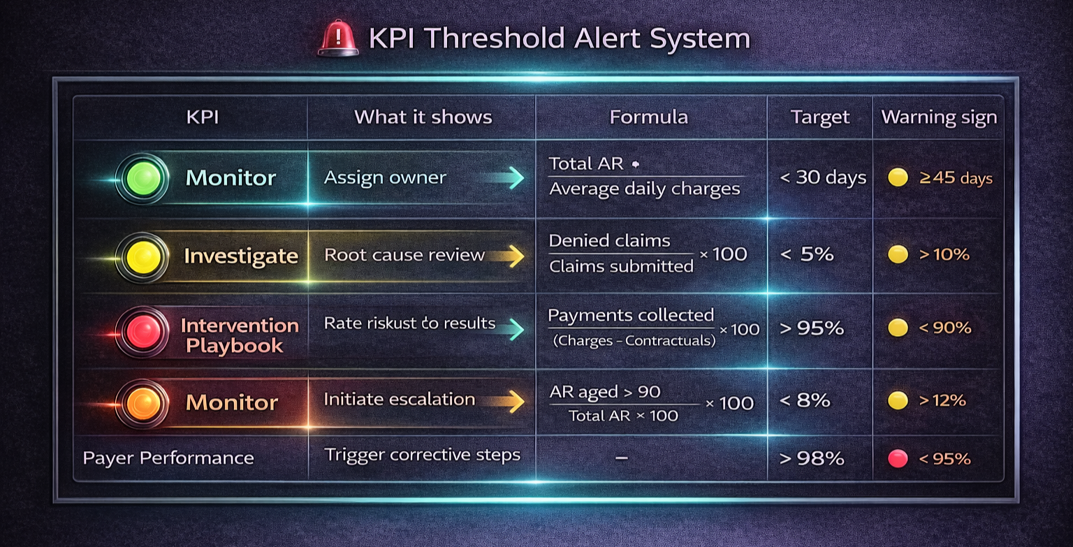 Start with a focused KPI set: Days in AR, Denial Rate, First-Pass Acceptance, Patient collections %.