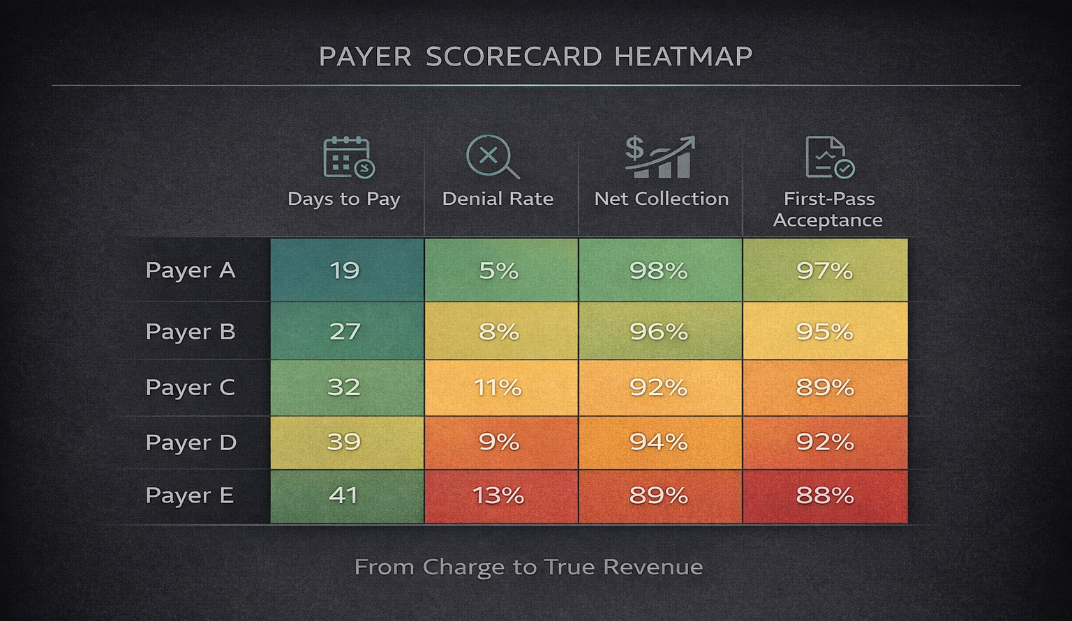 Payer, DaysToPay (e.g., 28), DenialRate (e.g., 7%), FirstPass (e.g., 92%), NetCollection (e.g., 87%), ARBalance, AROver90