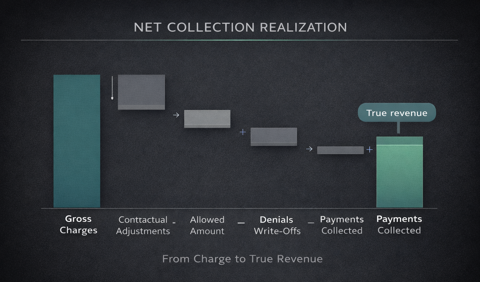 Net Collection Rate (%) = (Payments collected ÷ (Charges − Contractual adjustments)) × 100